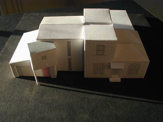 I made the paper model to show how the volumes were to be connected. A bathroom in the form of a cube was cantilevered on the street frontage and partly rotated to face the old cottage. New rusticated weatherboards match the old and the return walls are corrugated iron.